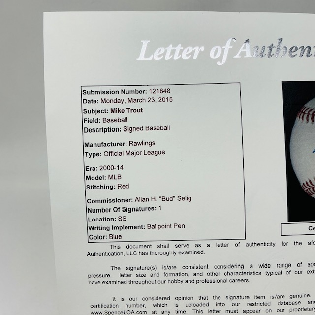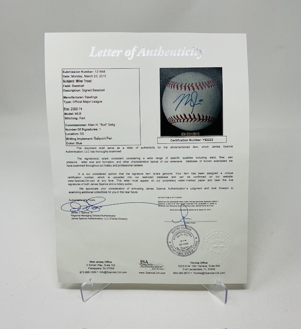 Mike Trout Autographed Los Angeles Angels ROML Baseball. JSA authenticated with full letter of authenticity.