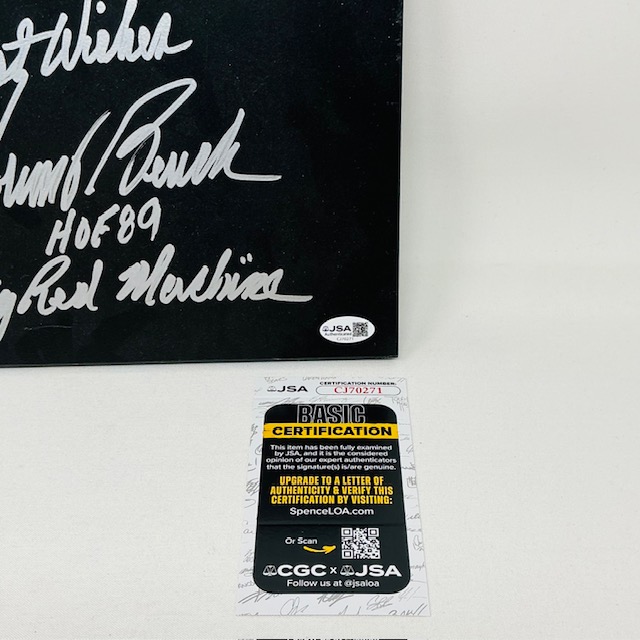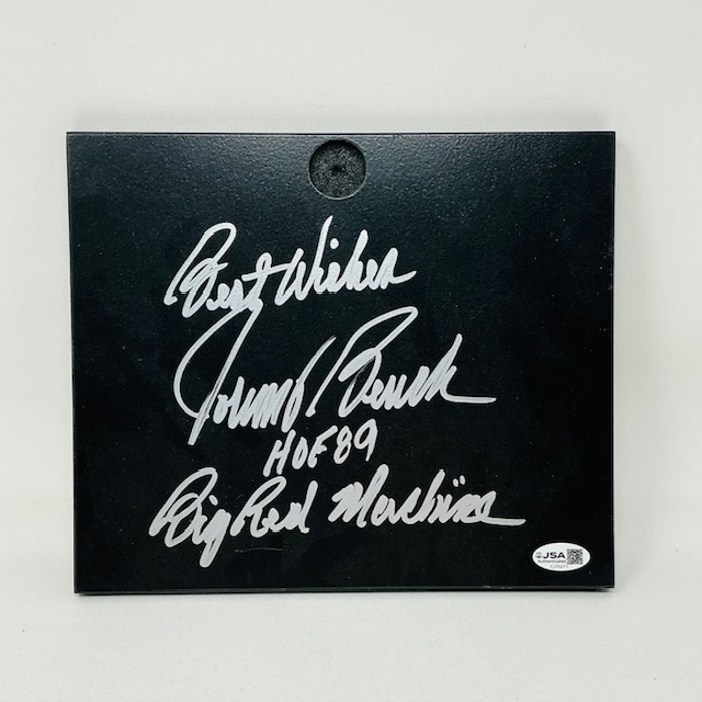 Johnny Bench Autographed Cincinnati Reds Multiple Inscriptions Huge Signature Wood Display Lid. JSA authenticated with matching card.