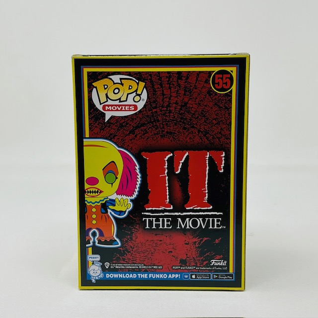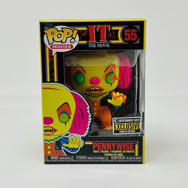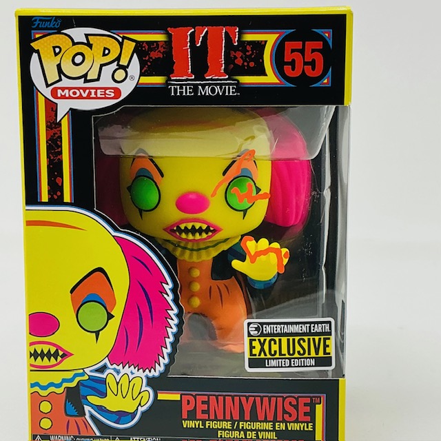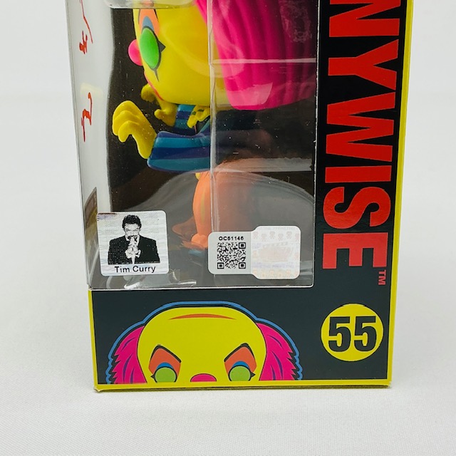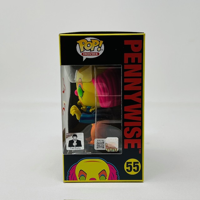 Tim Curry Autographed Pennywise IT The Movie Blacklight Funko Pop #55. OC Marketing and Tim Curry authenticated.