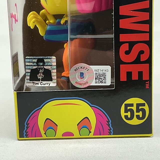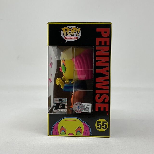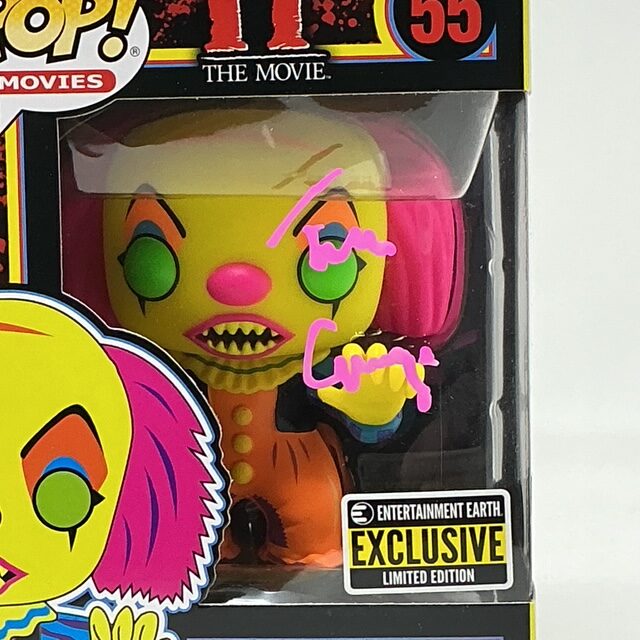 Tim Curry Autographed Pennywise IT The Movie Limited Edition Blacklight Funko Pop #55. Beckett and Tim Curry authenticated.