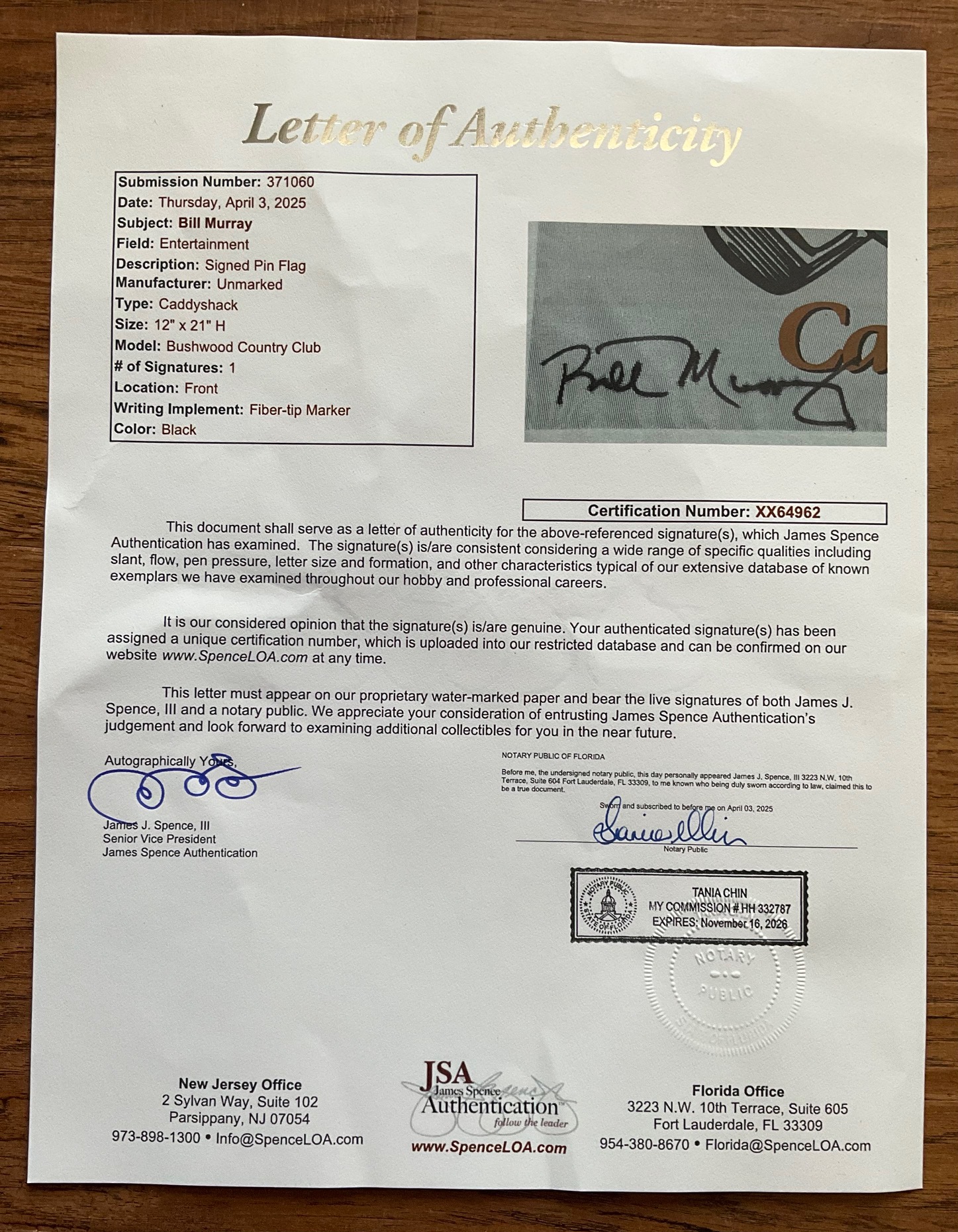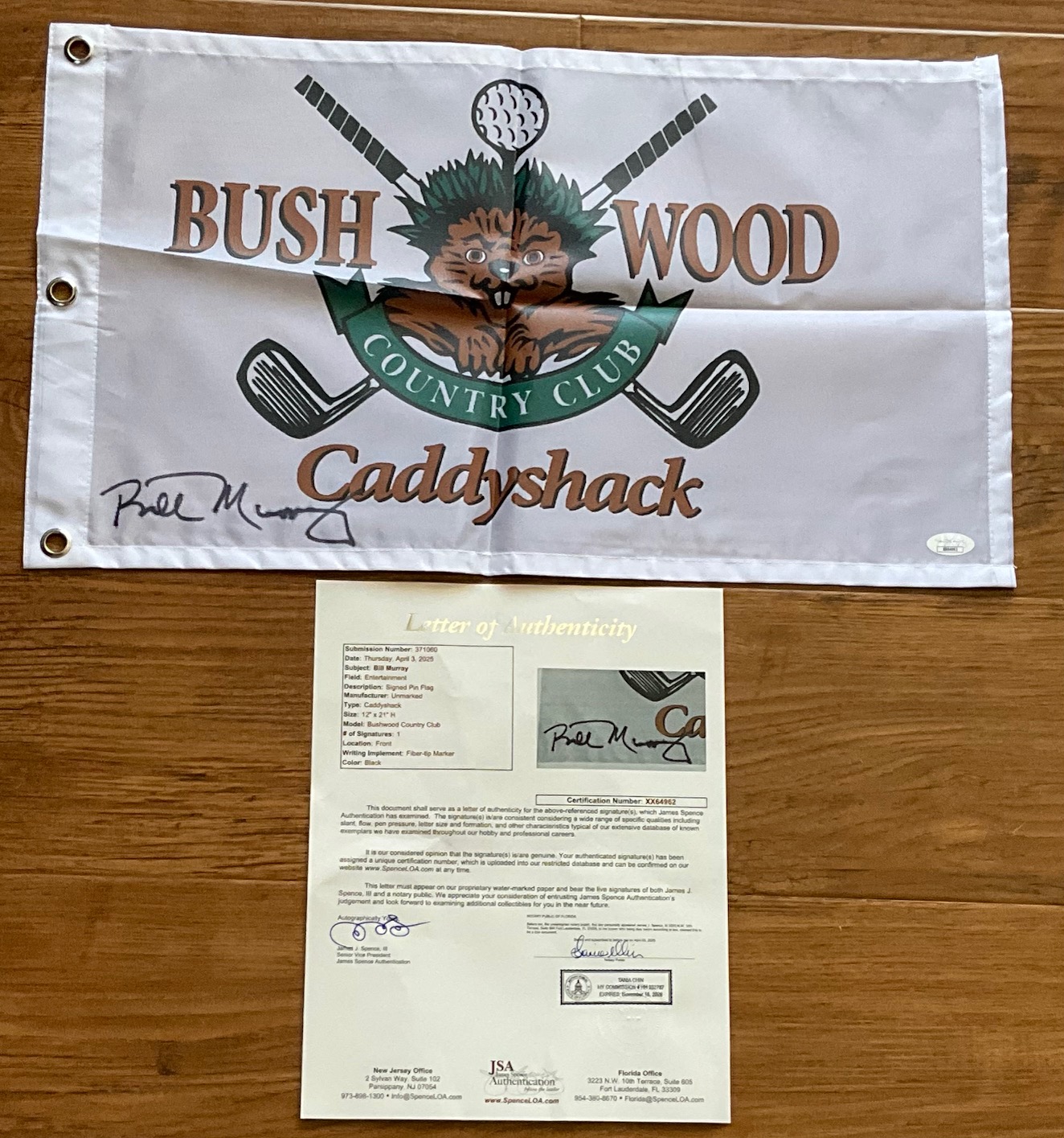 Bill Murray Autographed Caddyshack 12X21 Bush Wood Country Club Flag. JSA authenticated with full letter of authenticity.